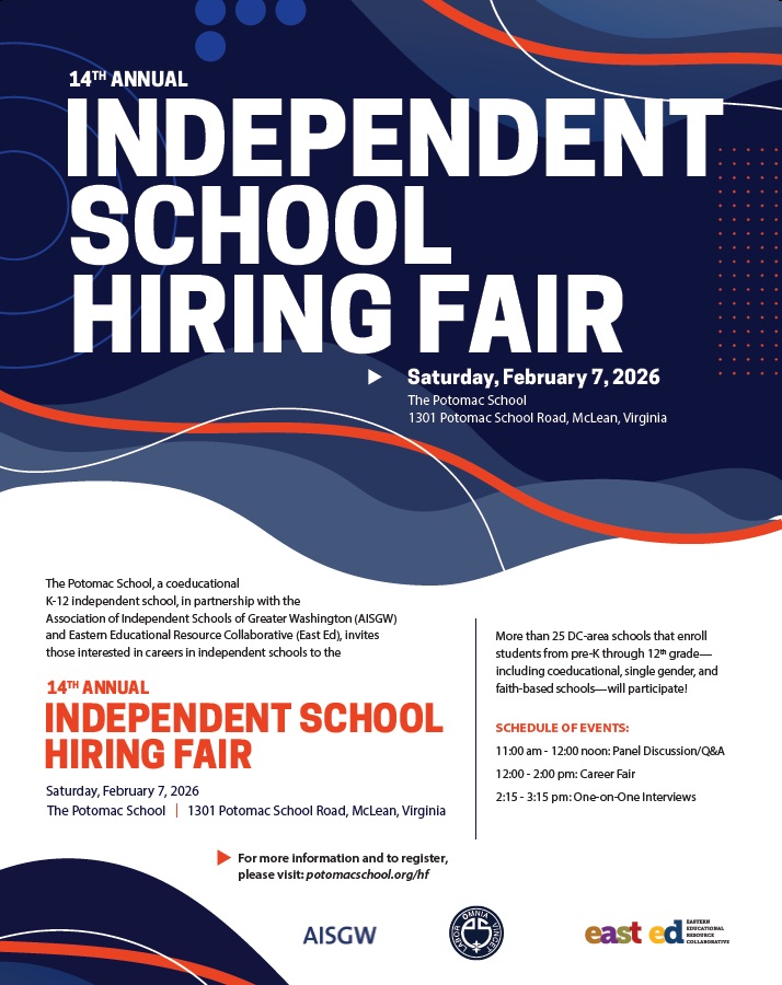The Potomac School, a coeducational K-12 independent school, in partnership with the Association of Independent Schools of Greater Washington (AISGW) and Eastern Educational Resource Collaborative (East Ed), invites those interested in careers in independent schools to the: